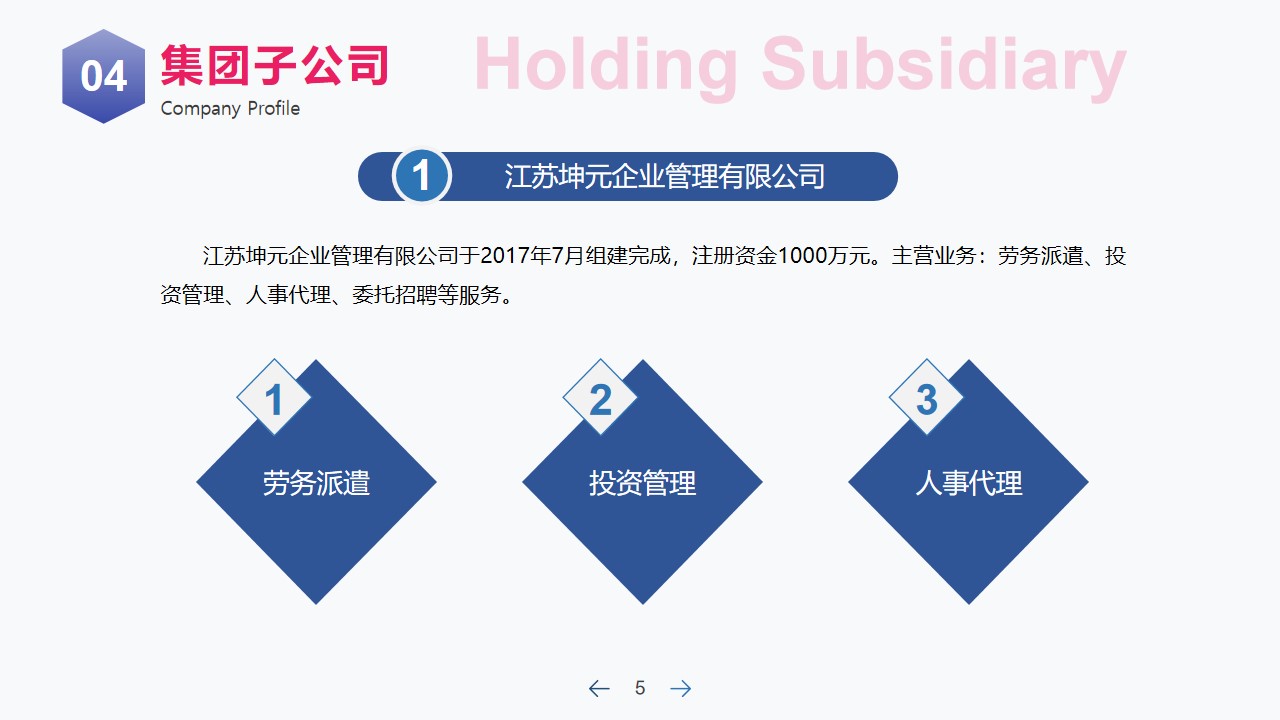 江苏坤元企业管理有限公司于2017年7月组建完成,注册资金1000万元。主营业务:劳务派遣、投资管理、人事代理、委托招聘等服务。
