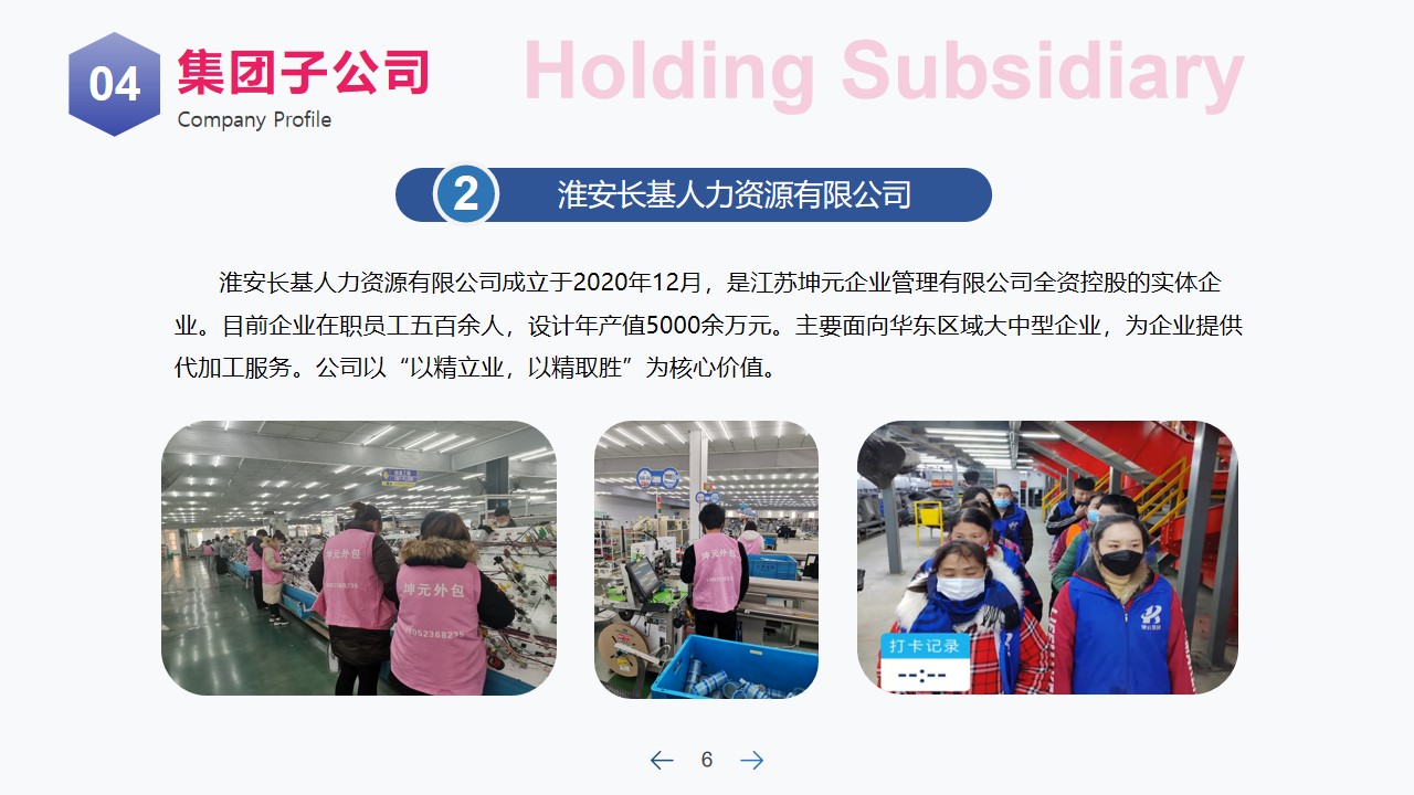 淮安长基人力资源有限公司成立于2020年12月,是江苏坤元企业管理有限公司全资控股的实体企业。目前企业在职员工五百余人,设计年产值5000余万元。主要面向华东区域大中型企业,为企业提供代加工服务。公司以“以精立业,以精取胜”为核心价值。