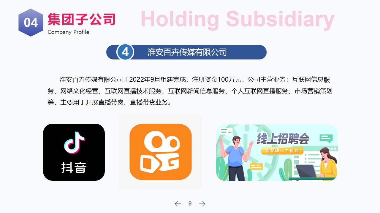 淮安三众传媒有限公司于2022年9月组建完成,注册资金100万元。公司主营业务:互联网信息服务、网络文化经营、互联网直播技术服务、互联网新闻信息服务、个人互联网直播服务、市场营销策划等,主要用于开展直播带岗、直播带货业务。