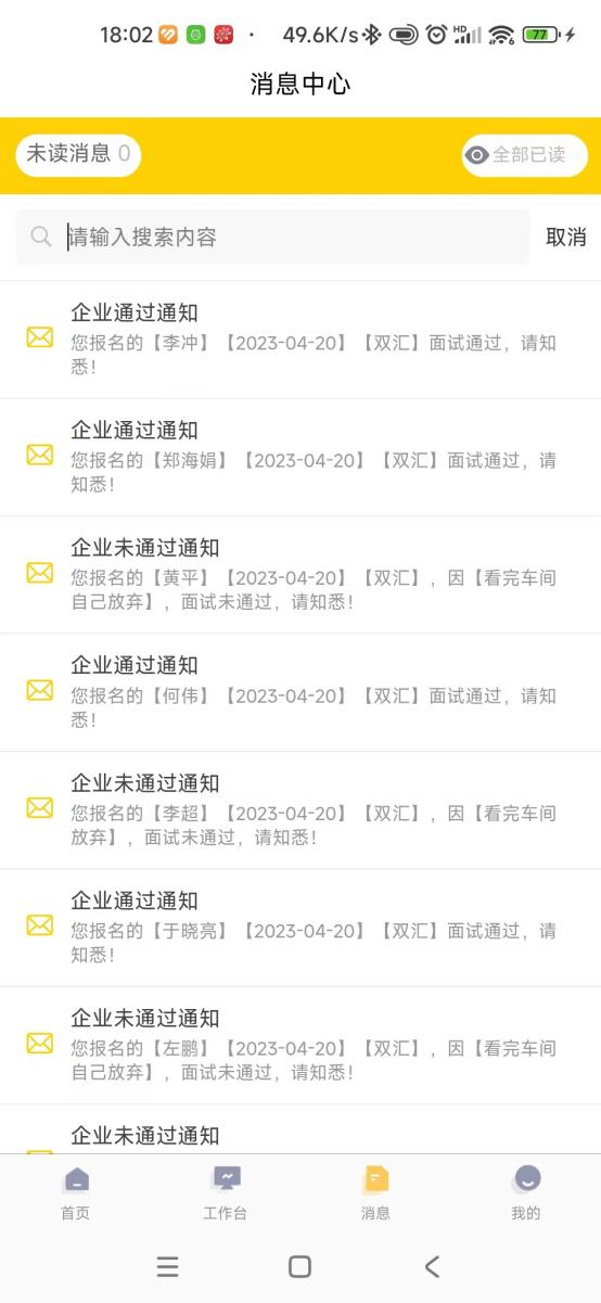 消息中心展示各种收到的消息,比如面试结果提醒,入职提醒,工资条发放提醒等。