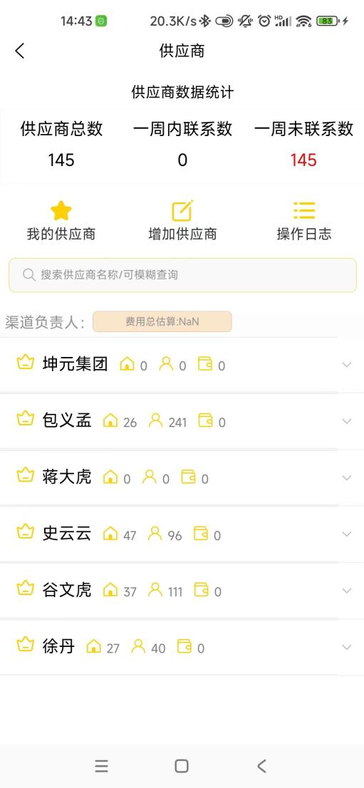 供应商,使用路径在工作台-企业管理-供应商,供应商是市场部门专用的功能,此功能可管理供应商的各种数据,比如供应商数、当前员工在职数、预估供应商费用等。