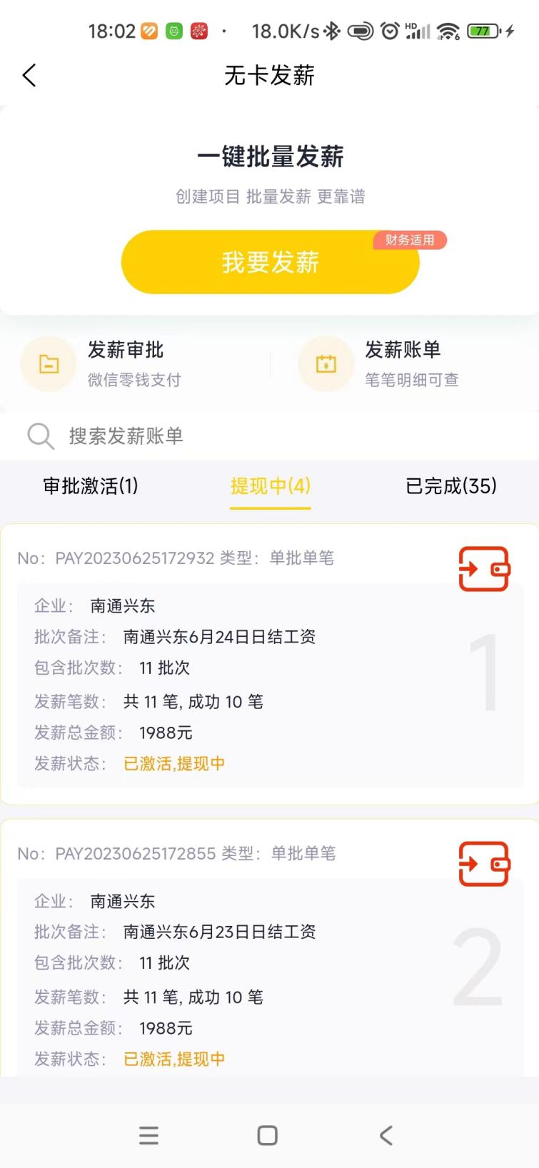 无卡发薪,使用路径在工作台-结算管理-无卡发薪,该功能主要是财务人员用来给员工发放工资和劳务报酬。通过微信支付,发薪速度更快更便捷。上传工资明细后,由员工自主提现,实时到账。