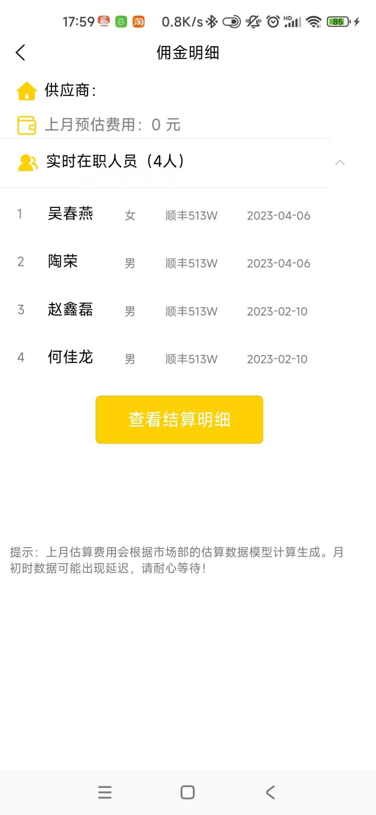 佣金明细,使用路径在工作台-结算管理-佣金明细,该功能可查询供应商在职人员与已结算费用明细。
